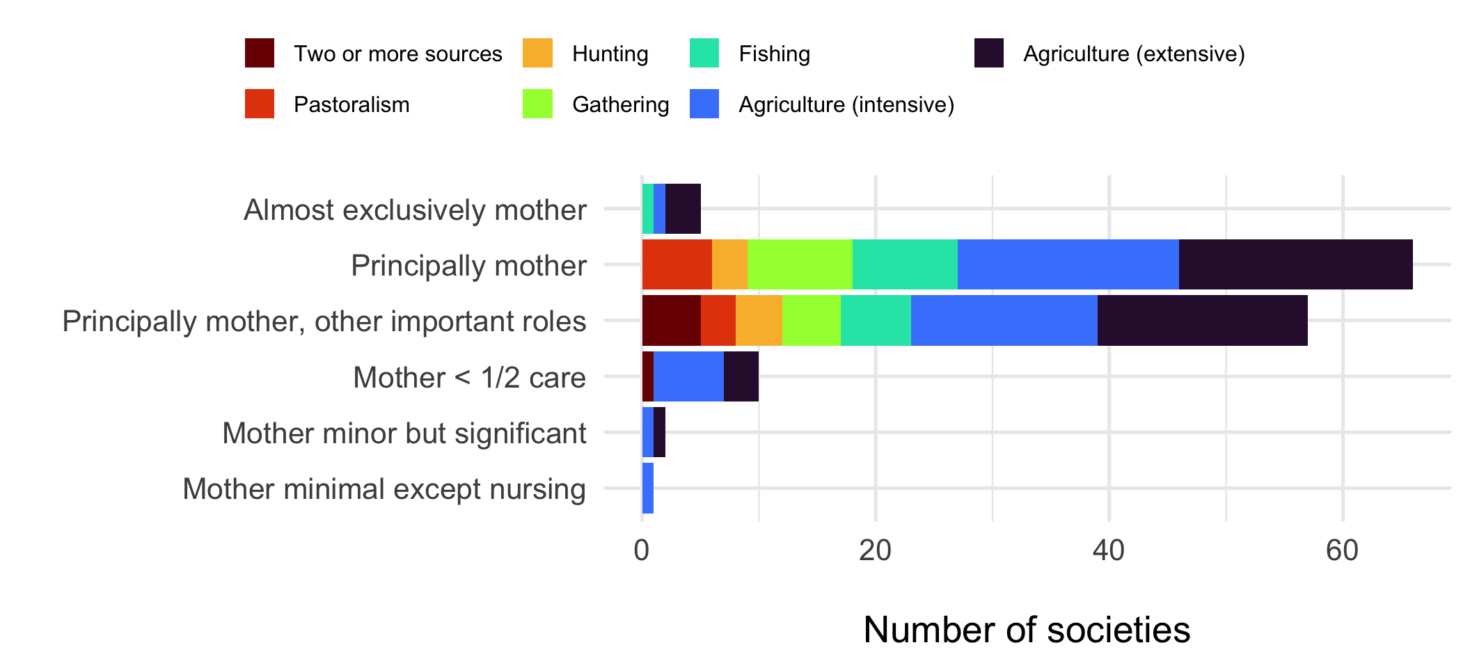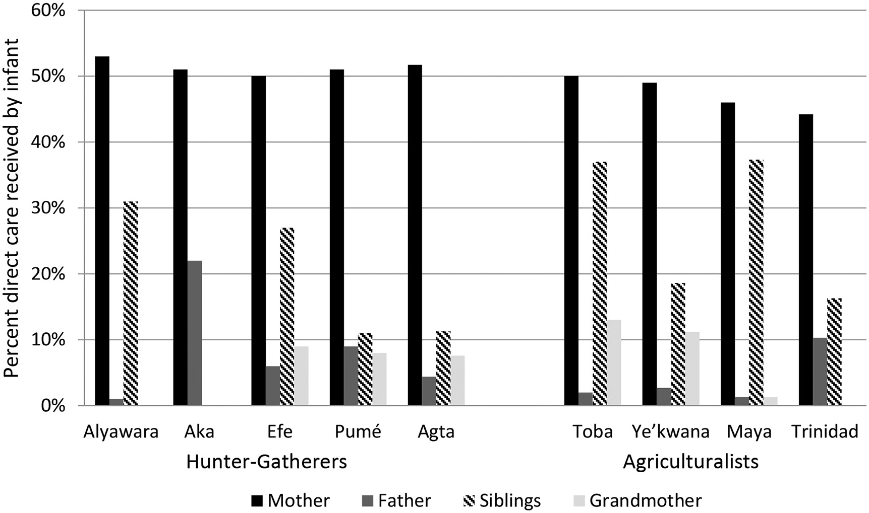 And here are data supporting the importance of allocare in hunter-gatherers and other traditional societies, but which also show that mothers do by far the most infant care, usually followed by older siblings: