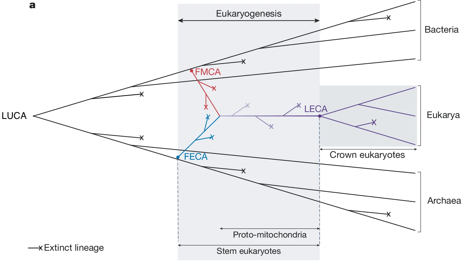 The evolution of sex commenced with the later evolution of eukaryotes, which have a more complex cellular structure. Eukaryotes were traditionally considered one of the three top-level domains of all life, but are now believed to have evolved from Archaea and then subsequently evolved a symbiosis with a bacterium (the origin of mitochondria), some 1.8-2.7 billion years ago (Vosseberg et al. 2024). See Figure 2.
