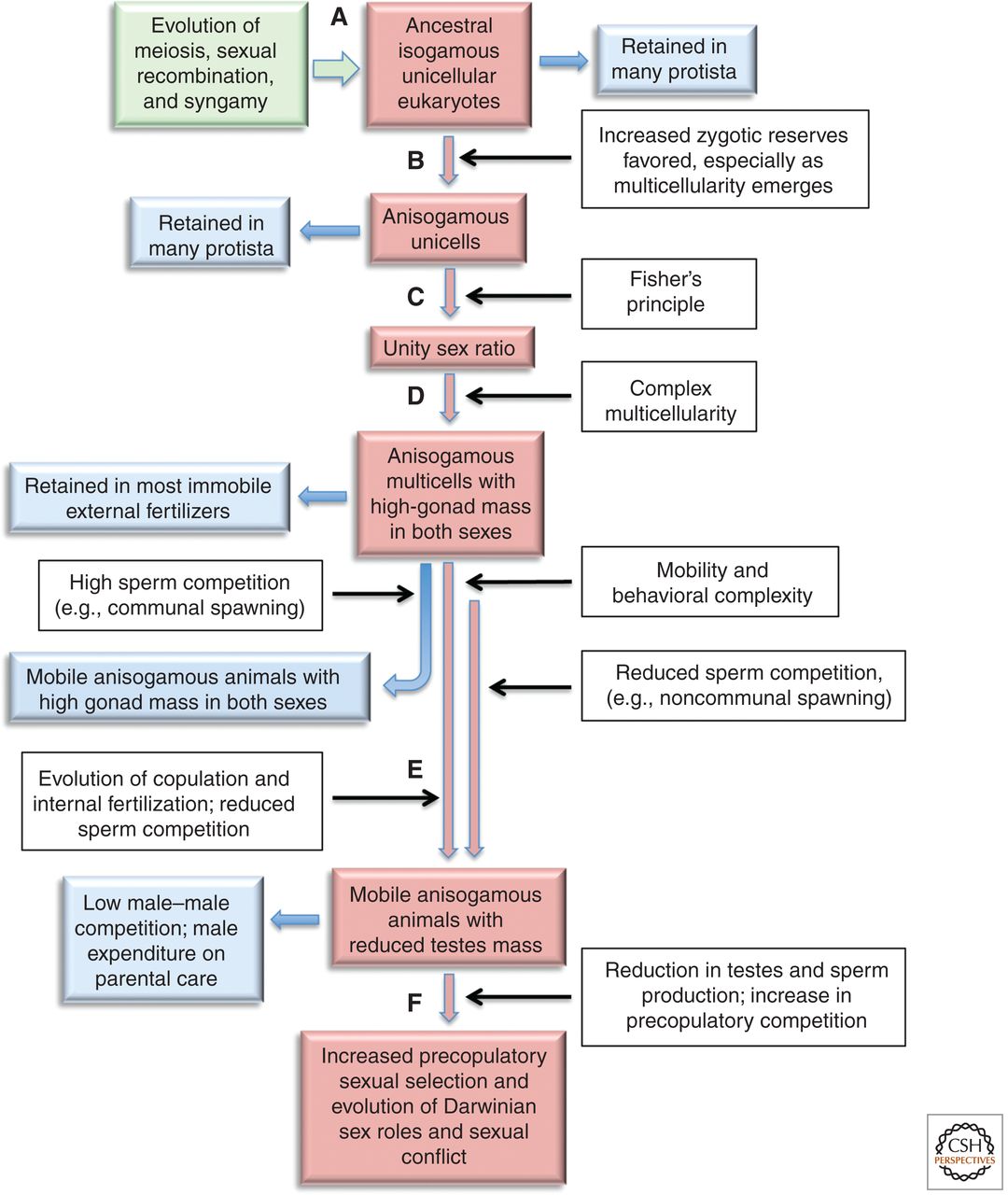 With the evolution of multicellularity in step D, organisms invest in specialized gonadal tissues, with consequent high levels of sperm competition in some species with, e.g., communal spawning, but reduced sperm competition others with noncommunal spawning. In step E, copulation evolves in some species, which reduces sperm competition but increases precopulatory (mating) competition and sexual selection, and the evolution of Darwinian sex roles. See Parker (2014) for details.