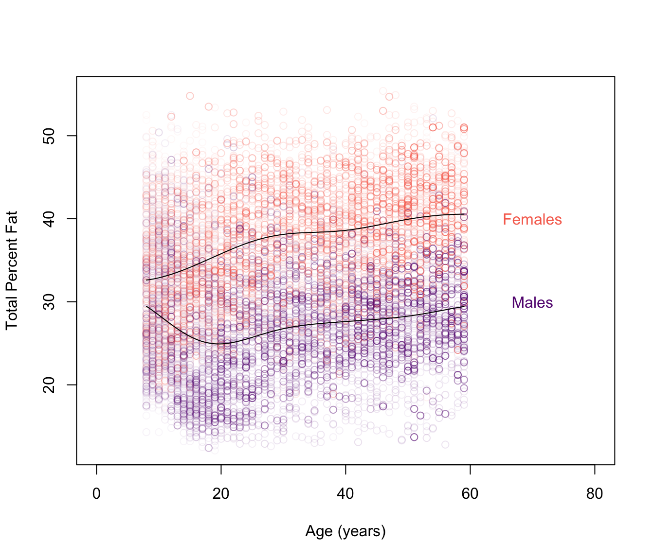 Sex differences in body composition (amounts and distributions of fat and muscle mass) provide a strong clue that women and men were engaged in different activities over the course of human evolution (on average!). Fuentes draws on NHANES data, so I will too. Regarding percent body fat, there is an increase in females after puberty, as Fuentes notes, and a decrease in males. See Figure 8.