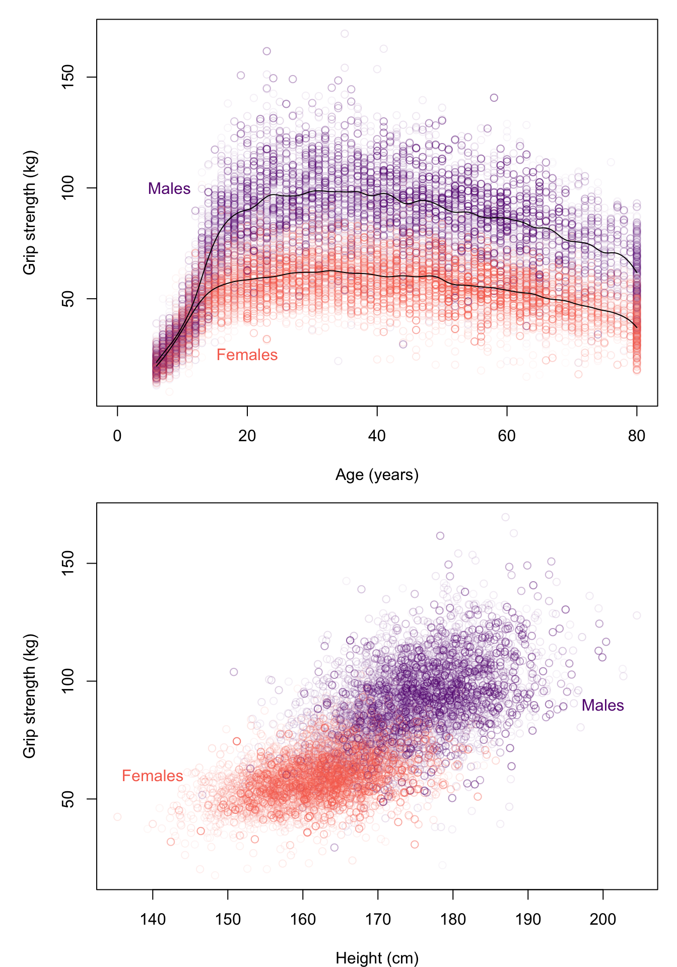 Regarding upper body strength, there is a bit more than “some degree” of sex difference, even when accounting for sex differences in height, which I’ve done here by plotting the two against each other (and it’s possible that sex differences in height and upper body strength evolved together). See Figure 9.