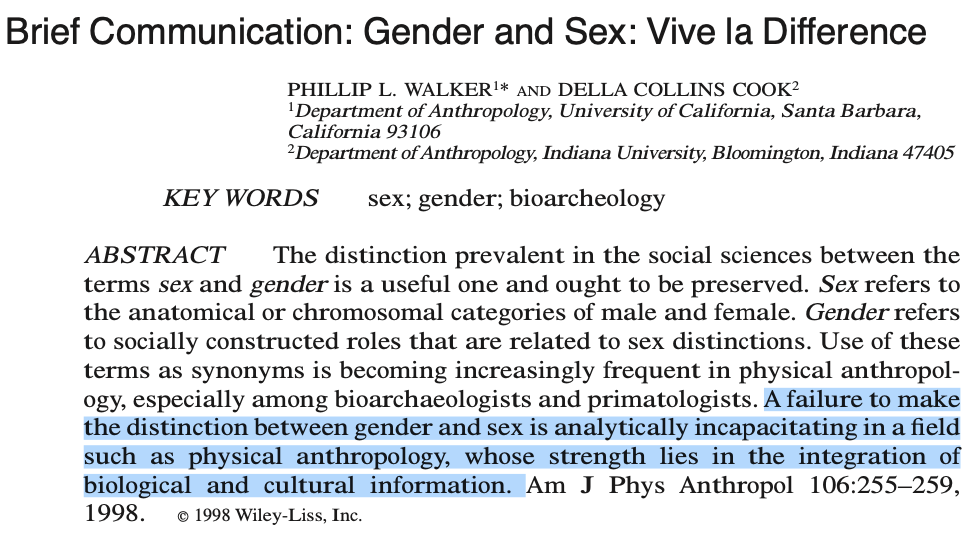 For Fuentes, a biocultural account of gender and sex requires deliberately conflating these distinct concepts as “gender/sex” to “reflect the intertwined biocultural reality of bodies and experiences more accurately. (p. 45)” Biological anthropologists Phil Walker and Della Cook (1998) critique this approach better than I could: